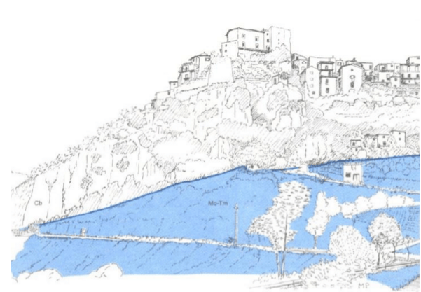 In questo settore dell’Appennino vengono a contatto due antichi domini paleogeografici, difatti la zona sabina viene chiamata zona di transizione tra questi due domini: un tratto del margine occidentale della Piattaforma carbonatica laziale-abruzzese (rilievi carbonatici dei Monti Carseolani e del gruppo montuoso del Monte Nuria) e un settore di raccordo della scarpata con il bacino pelagico umbro (Sabina occidentale). Il contatto tra questi due domini è determinato da una profonda linea tettonica con direzione circa N-S chiamata linea Olevano-Antrodoco. Questa linea tettonica, chiamato anche sovrascorrimento, è il risultato della tettonica compressiva che provoca un accavallamento di vari blocchi di crosta affastellati in grandi scaglie una sopra l’altra. Con il passare del tempo quindi si sono create catene parallele di monti da ovest verso est allineati secondo una direzione NW-SE. Questo sovrascorrimento di importanza regionale è possibile notarlo lungo le pendici orientali del Monte Cervia, un lungo rilievo asimmetrico formato da calcari e calcari marnosi di età compresa tra l’Eocene e il Miocene medio. Osservando il versante occidentale della Valle del Turano si nota che la parte inferiore del pendio è meno acclive e dalle forme più dolci, questa morfologia corrisponde infatti all’affioramento di torbiditi arenaceo-pelitiche (un tipo di materiale più erodibile), mentre nella parte alta del versante, ben più ripida e con forme più aspre, affiorano calcari e marne (Formazione di Guadagnolo e dei Calcari a Briozoi e Litotamni); questa rottura di pendio è la testimonianza del contatto tettonico sopracitato (Linea Olevano-Antrodoco). Altri sovrascorrimenti che marcano nette rotture di pendio, analoghe a quelle del Monte Cervia, sono presenti nei pressi di Castel di Tora (figura precedente), Monte Navegna (foto precedente) e Monte Aquilone.